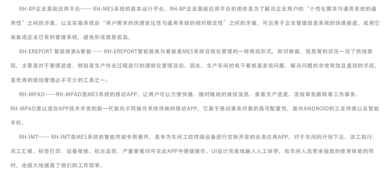 RH-MES系统具备令人瞩目的特性:高度灵活的可配置性、基于SOA架构的技术平台、实现JIT/精益生产、适用于个性化且快速变化生产模式。